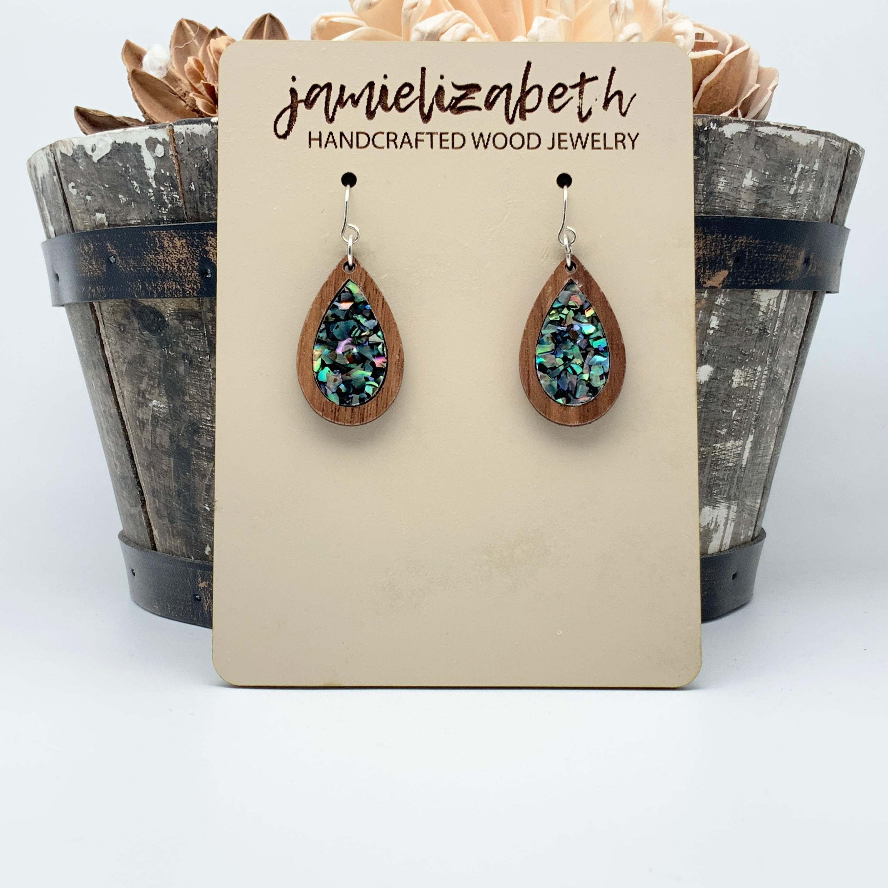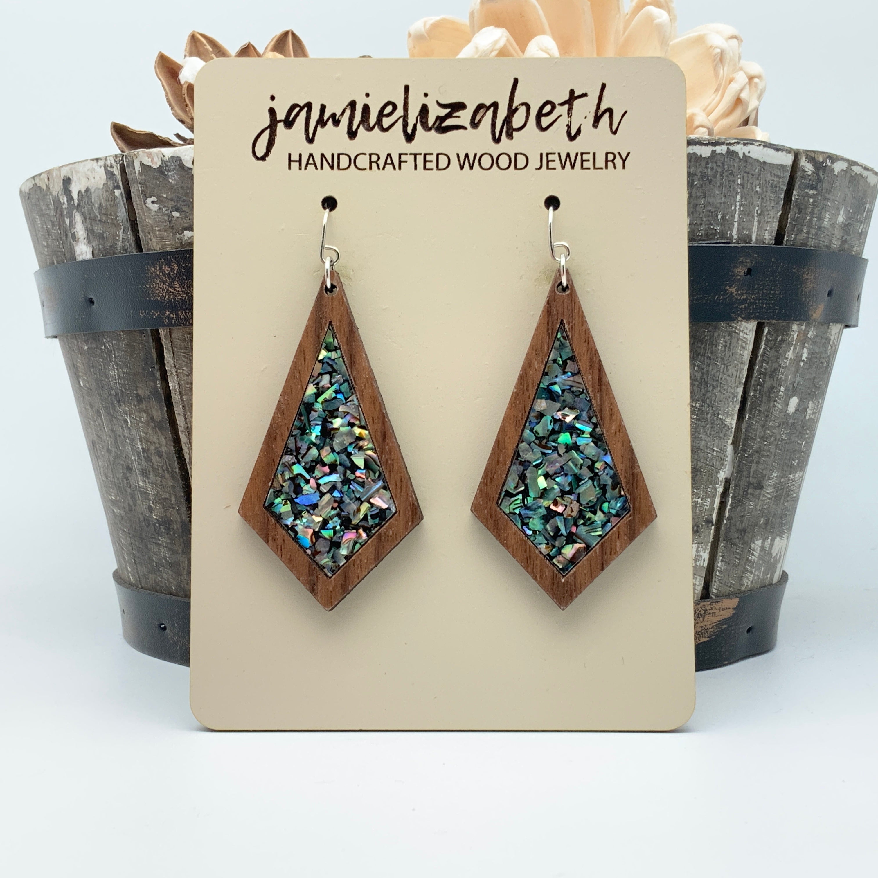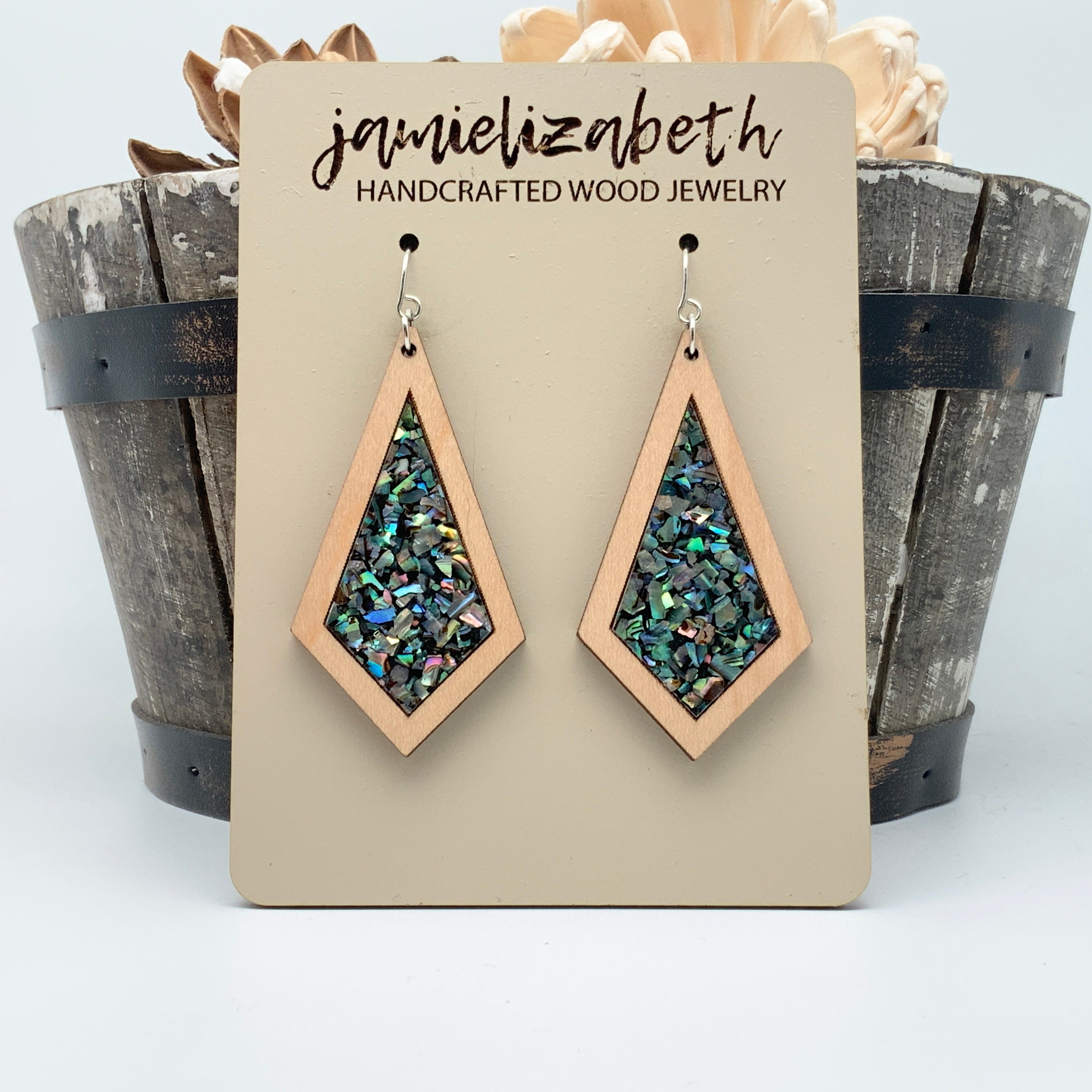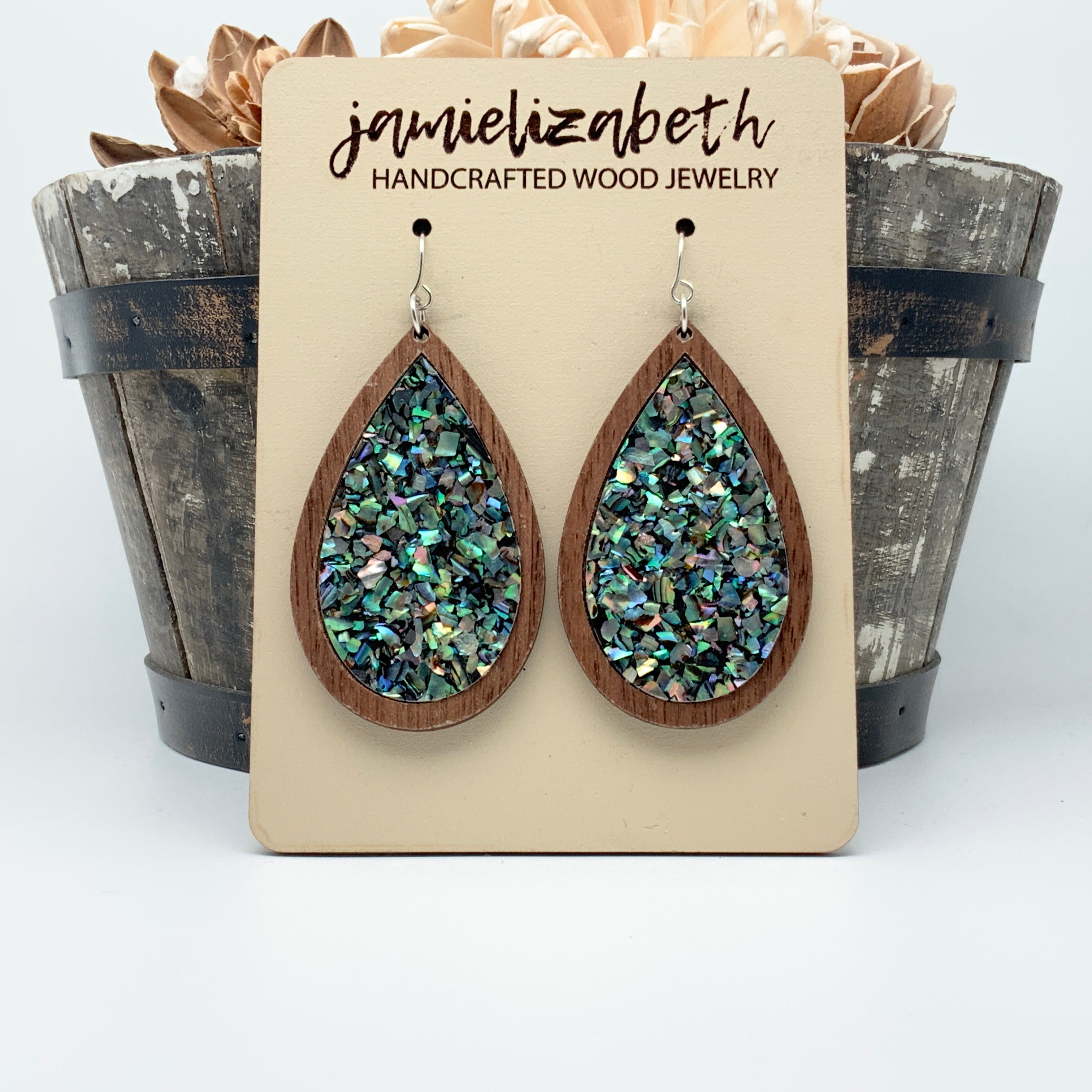 These earrings and necklace are crafted from crushed abalone shell, giving them a unique and beautiful look. The shells are a perfect way to add an elegant, natural touch to any outfit.