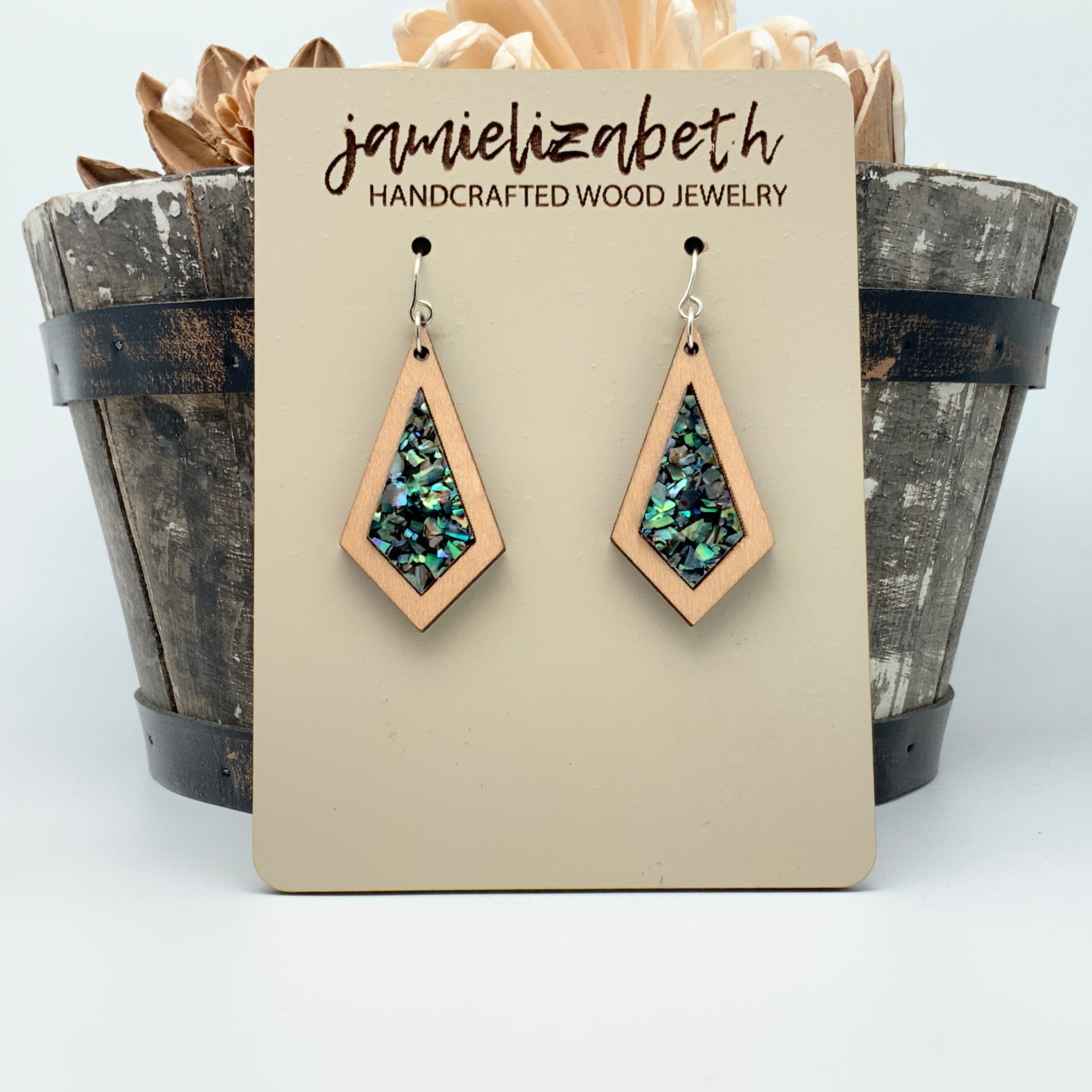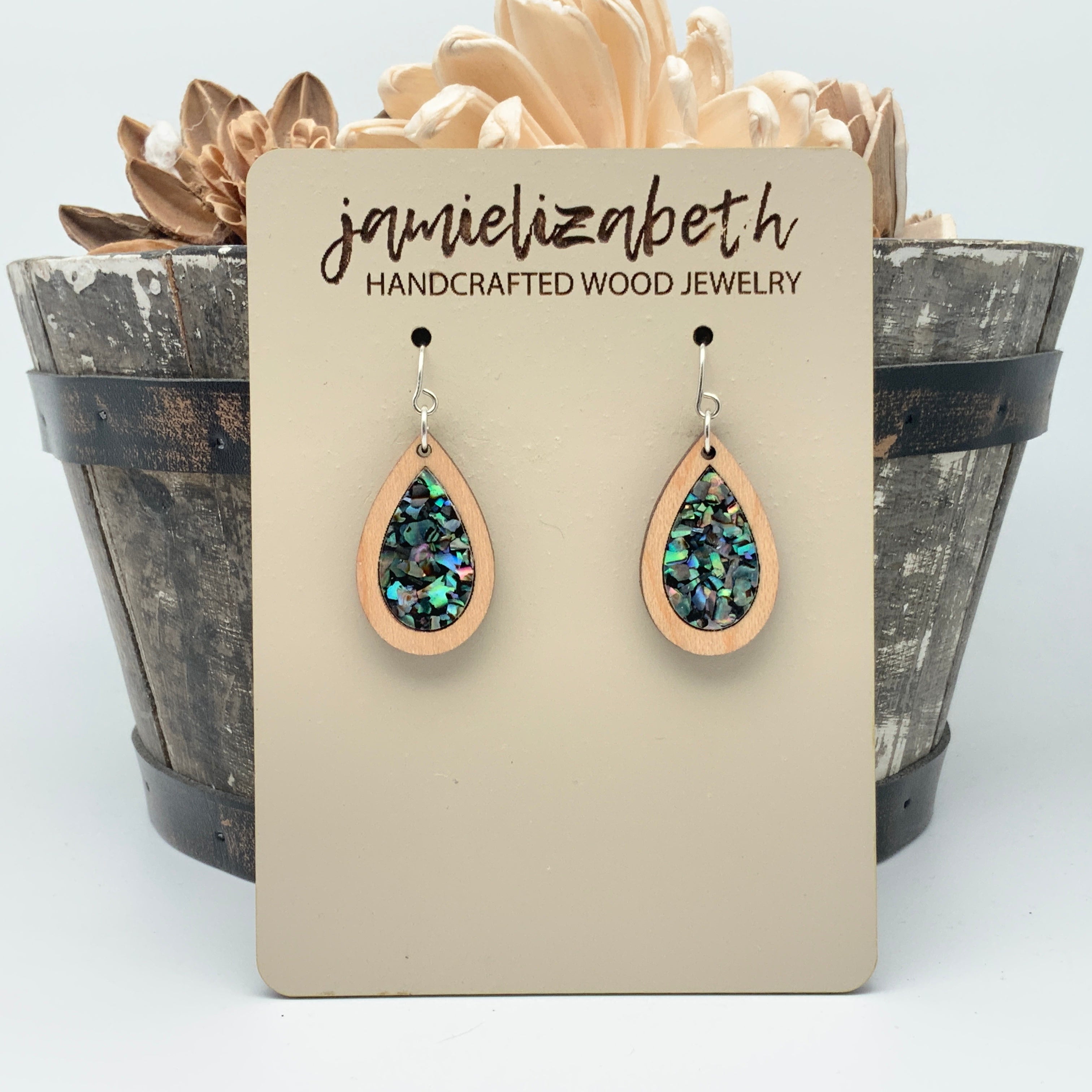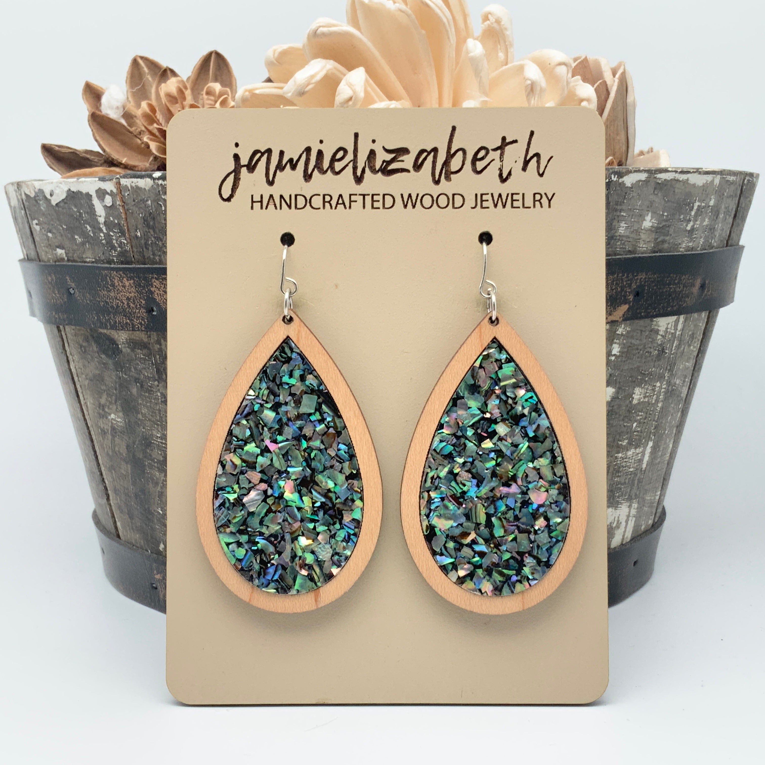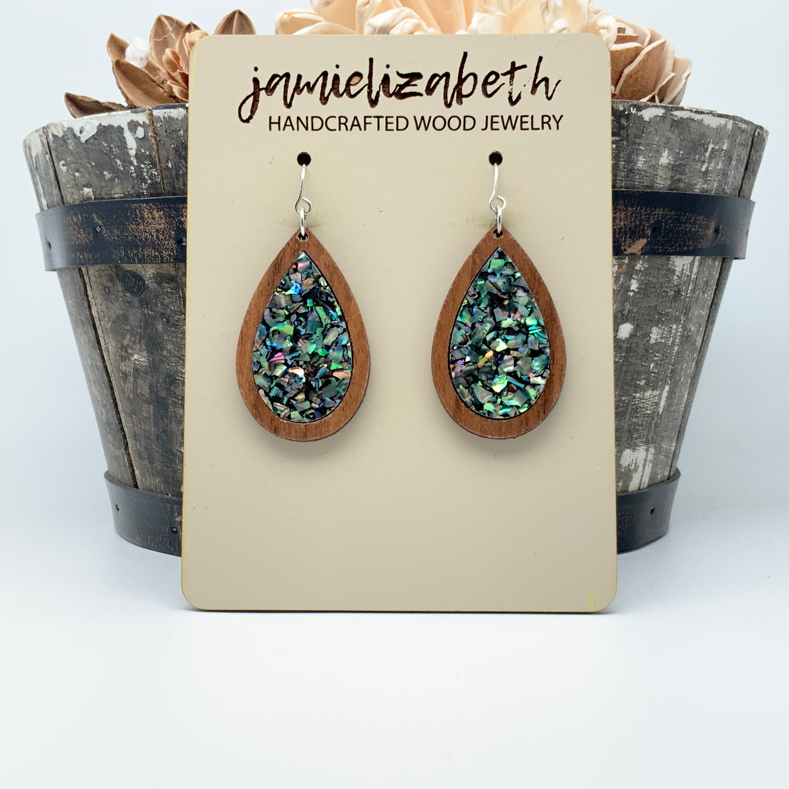 These earrings and necklace are crafted from crushed abalone shell, giving them a unique and beautiful look. The shells are a perfect way to add an elegant, natural touch to any outfit.