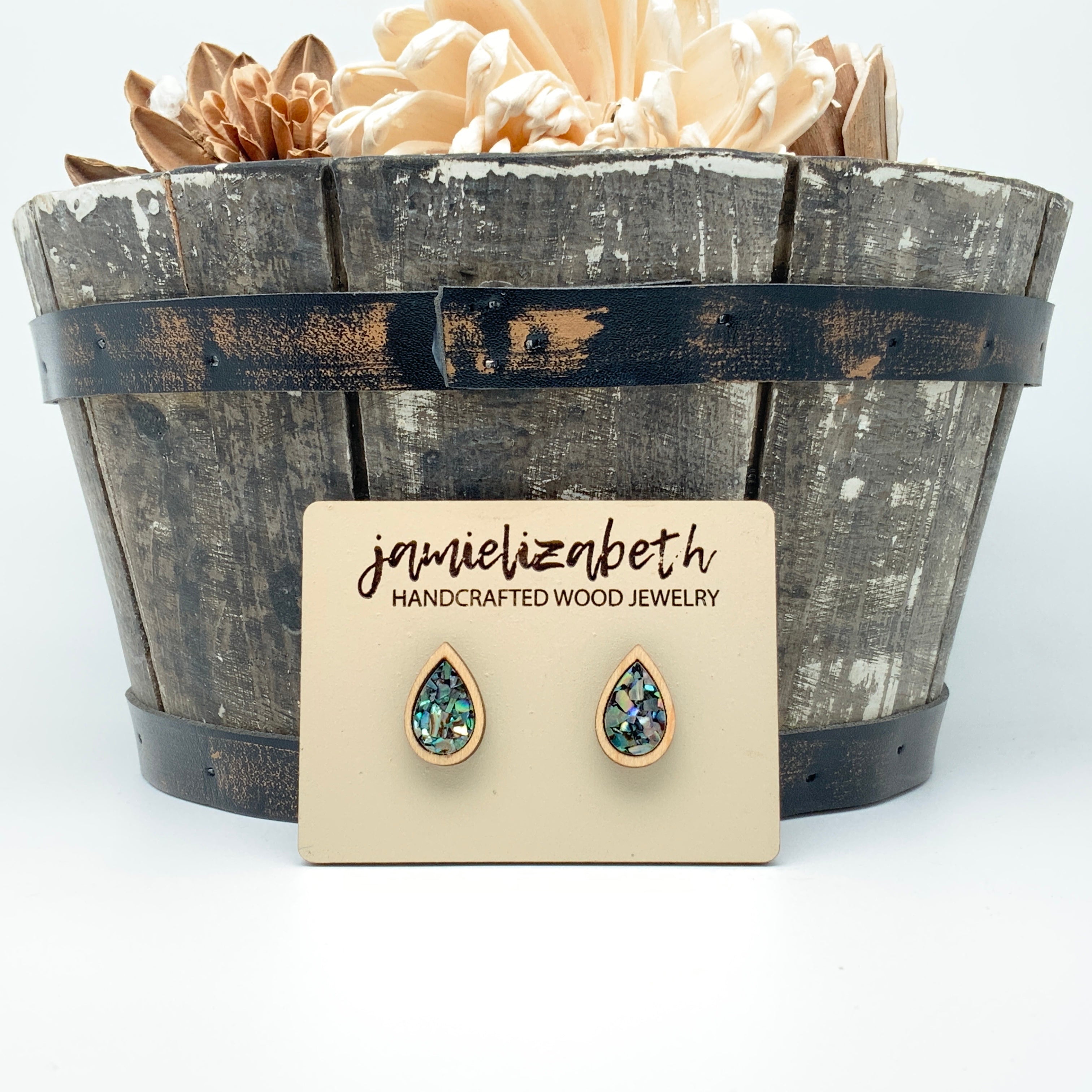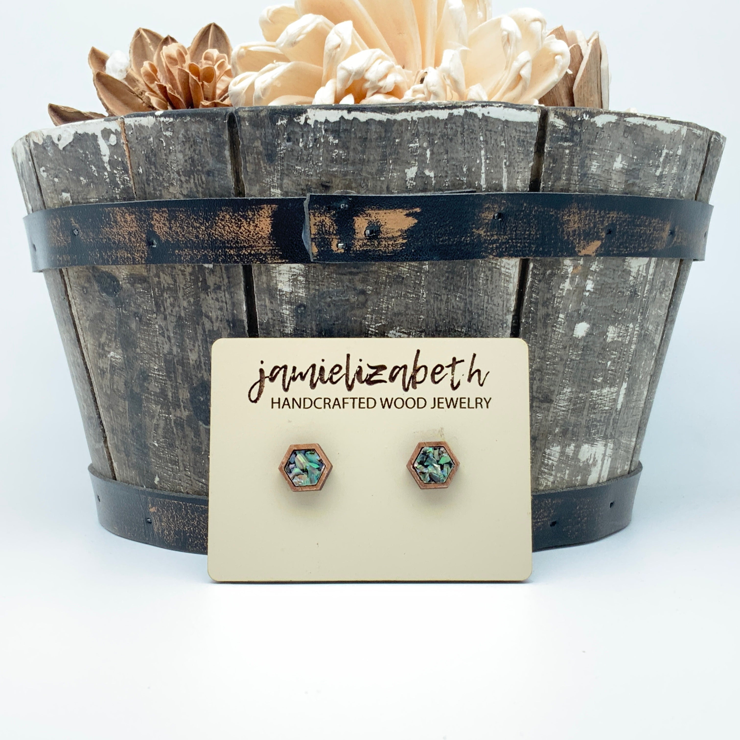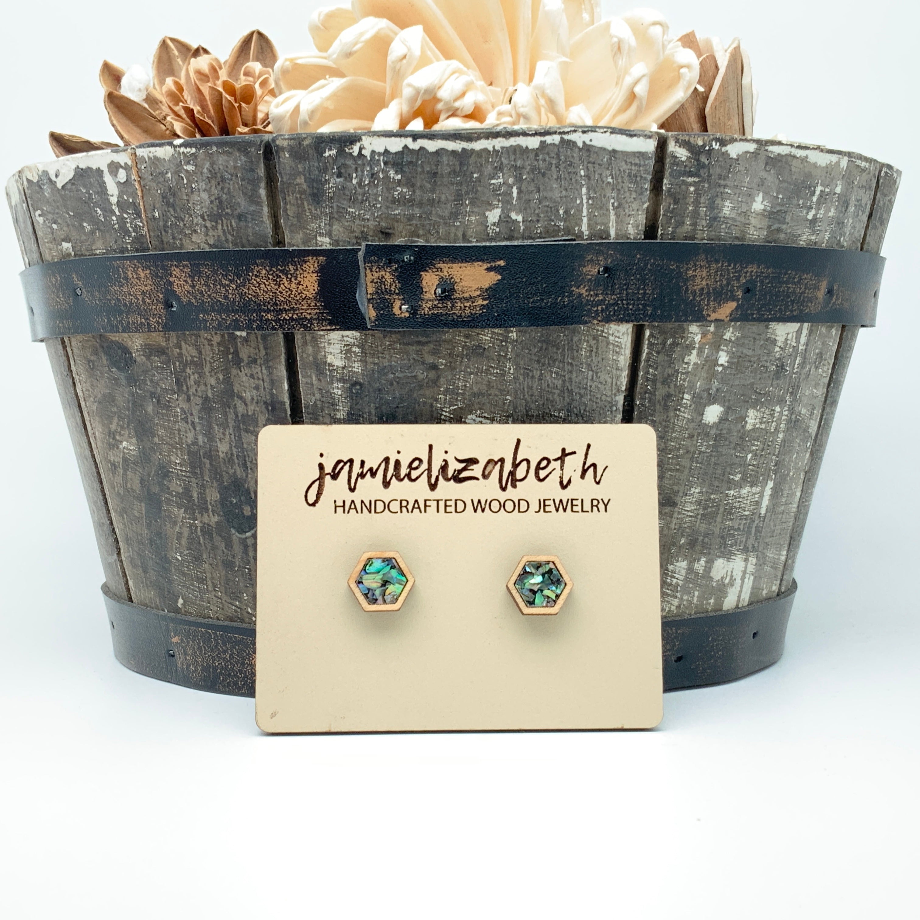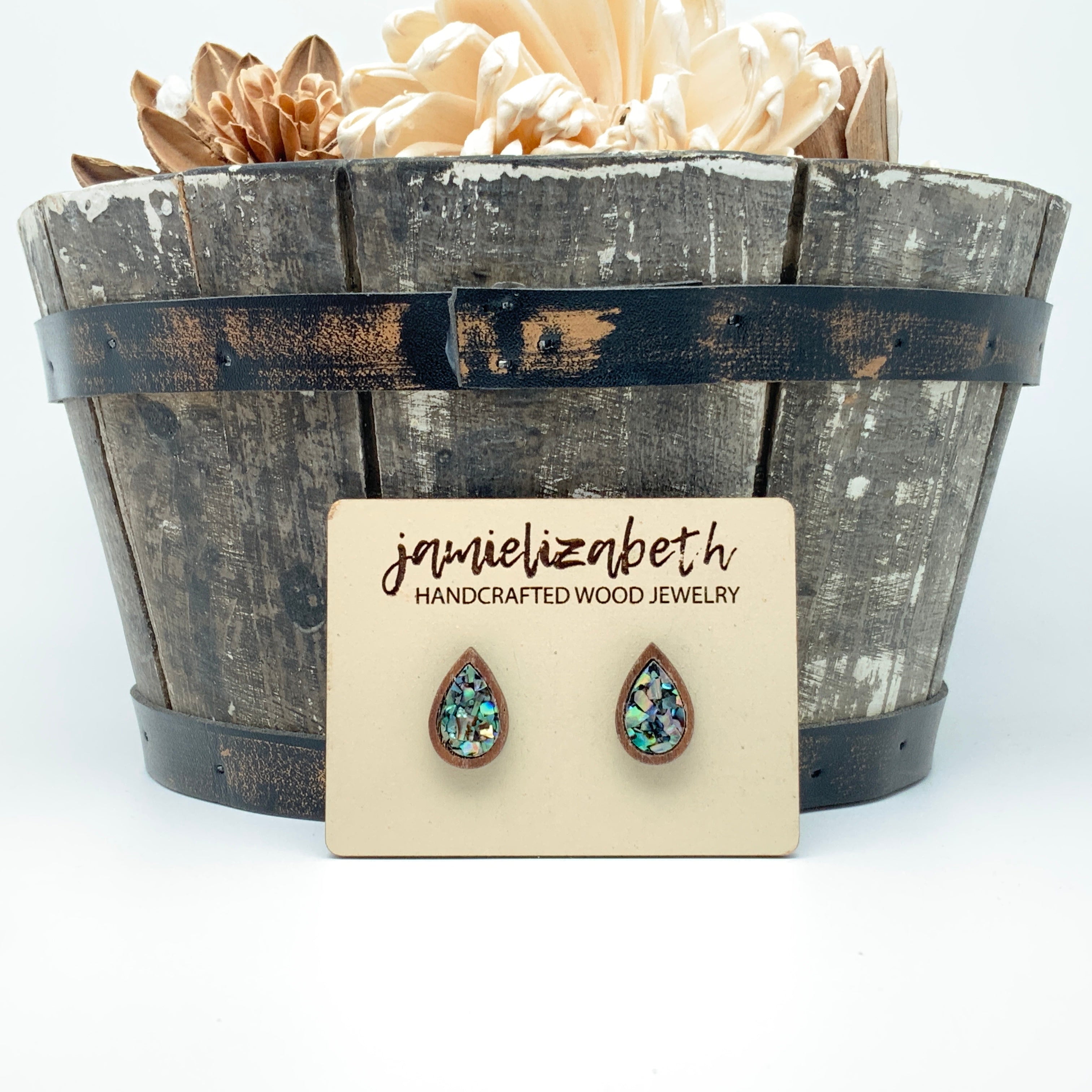 These earrings and necklace are crafted from crushed abalone shell, giving them a unique and beautiful look. The shells are a perfect way to add an elegant, natural touch to any outfit.