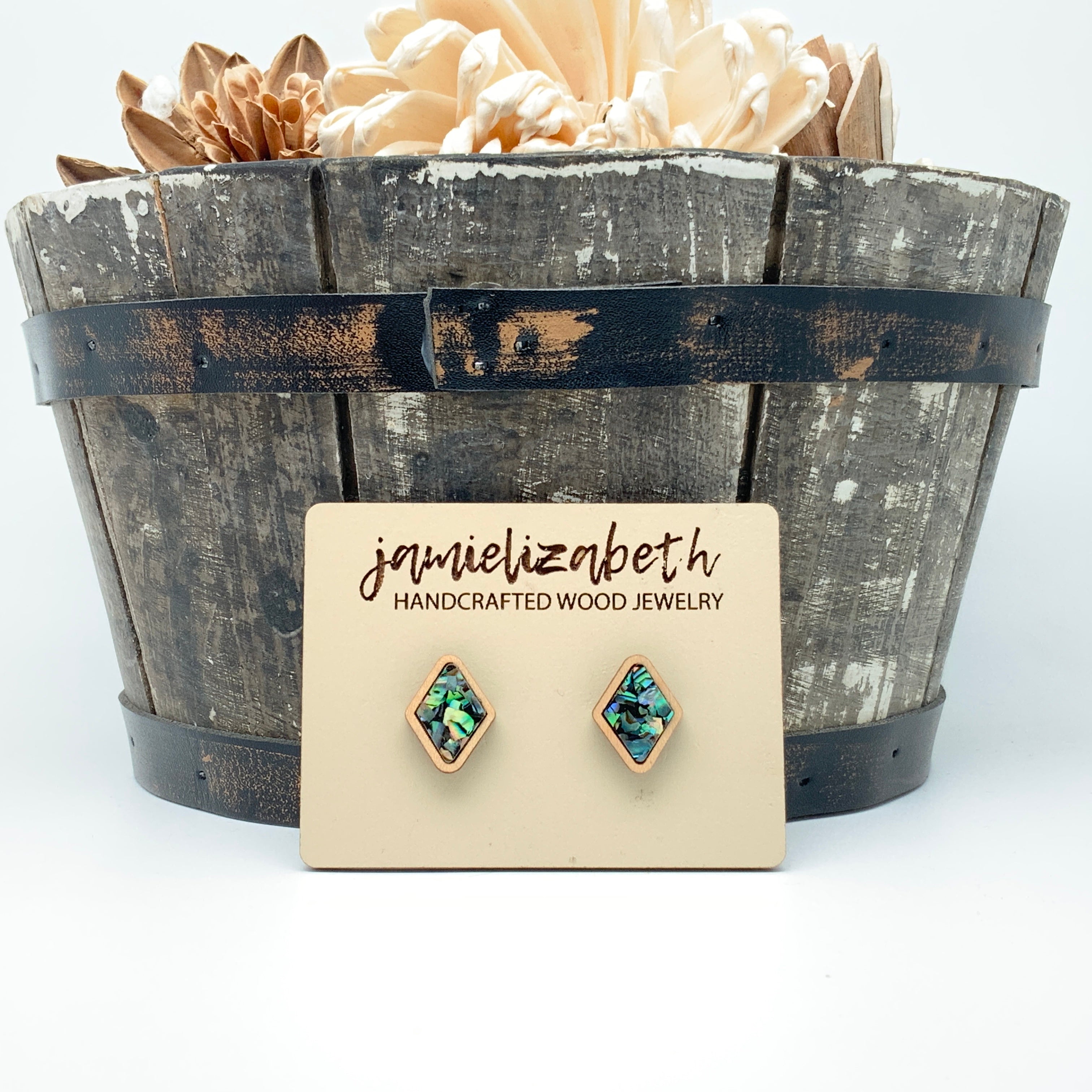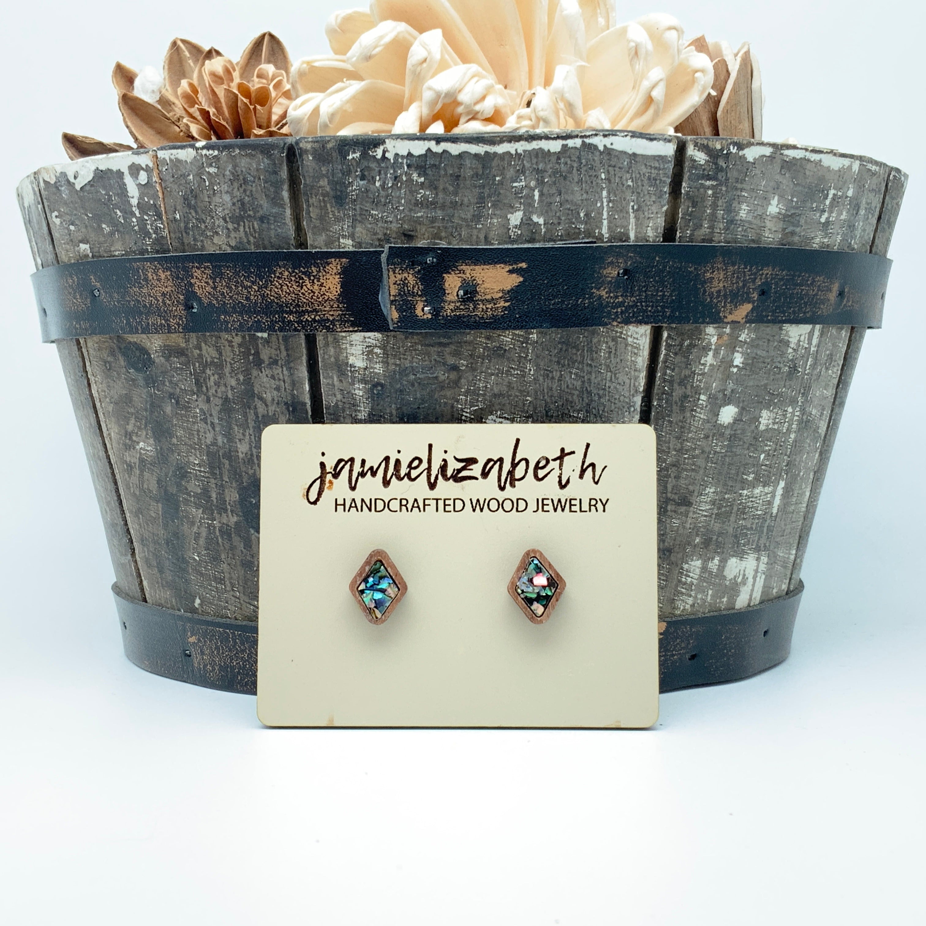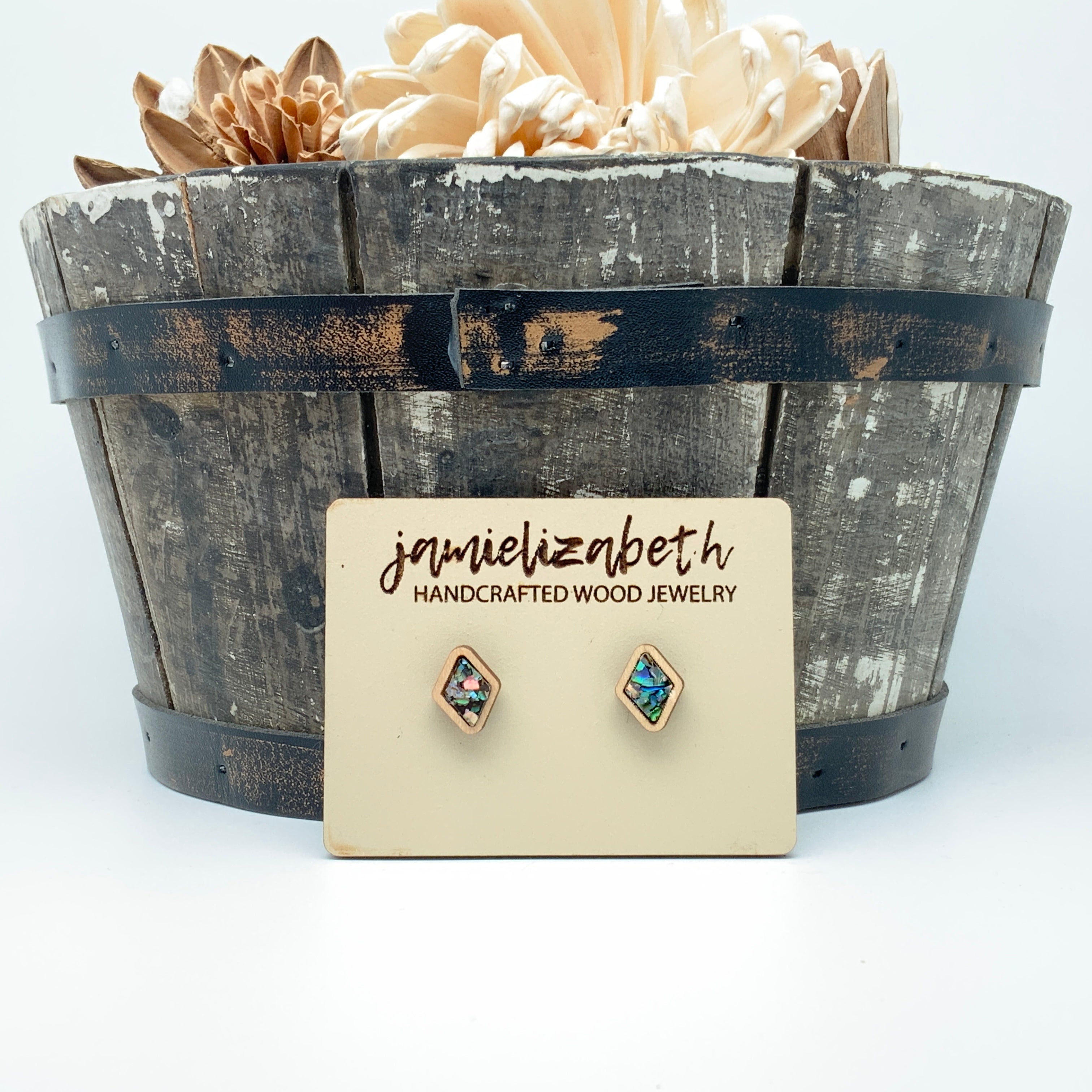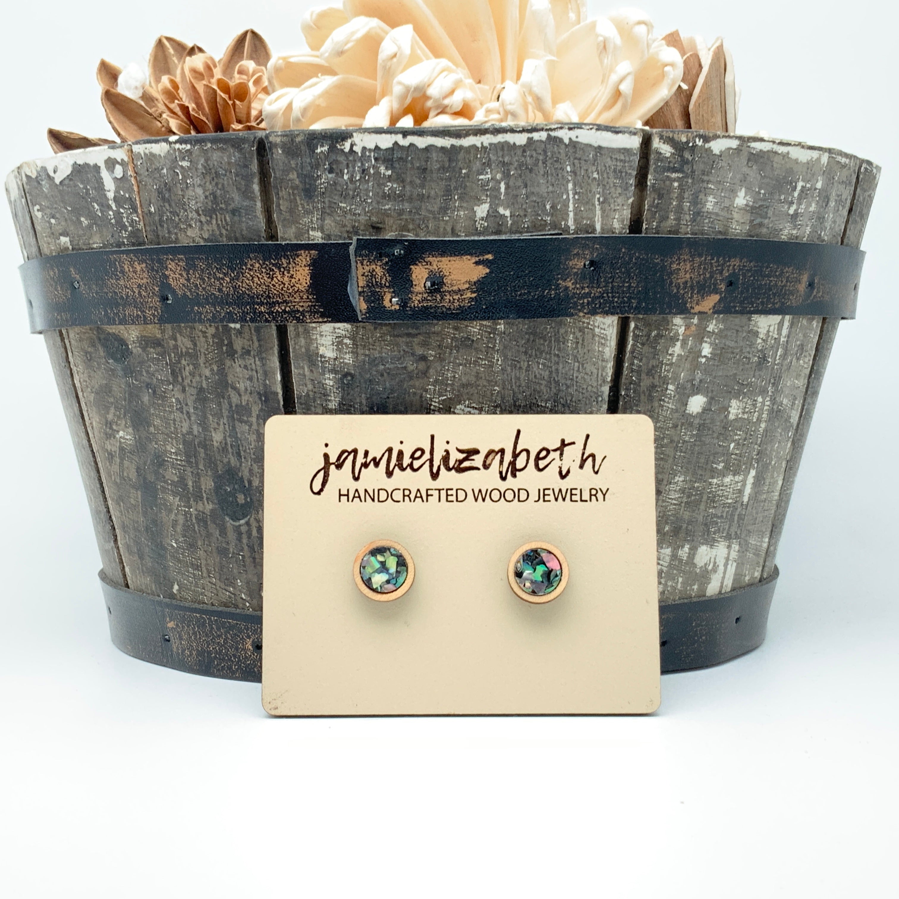 These earrings and necklace are crafted from crushed abalone shell, giving them a unique and beautiful look. The shells are a perfect way to add an elegant, natural touch to any outfit.