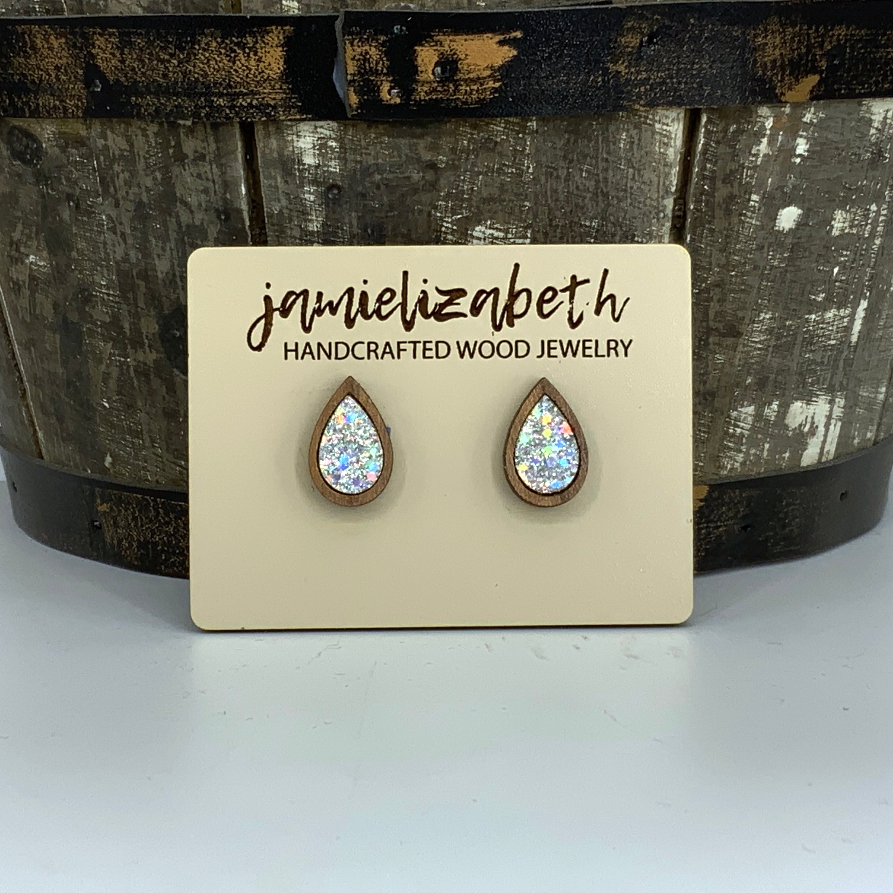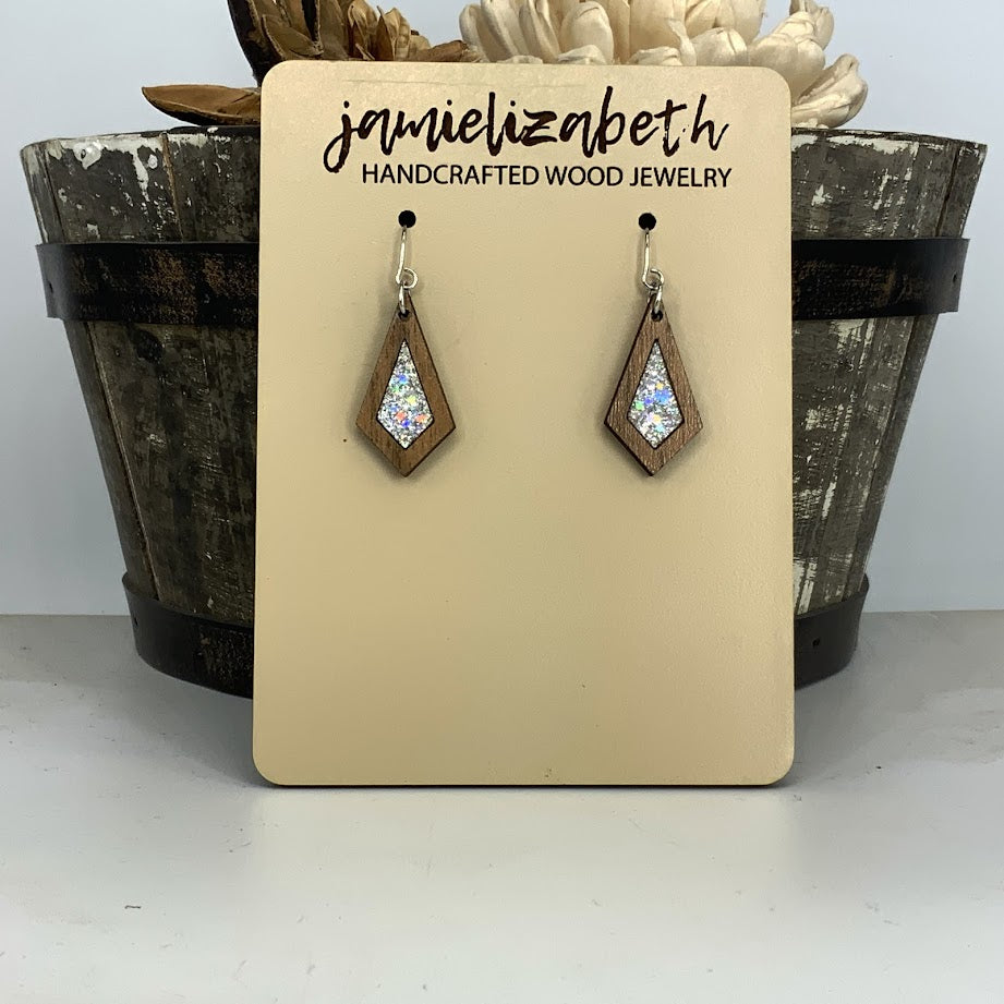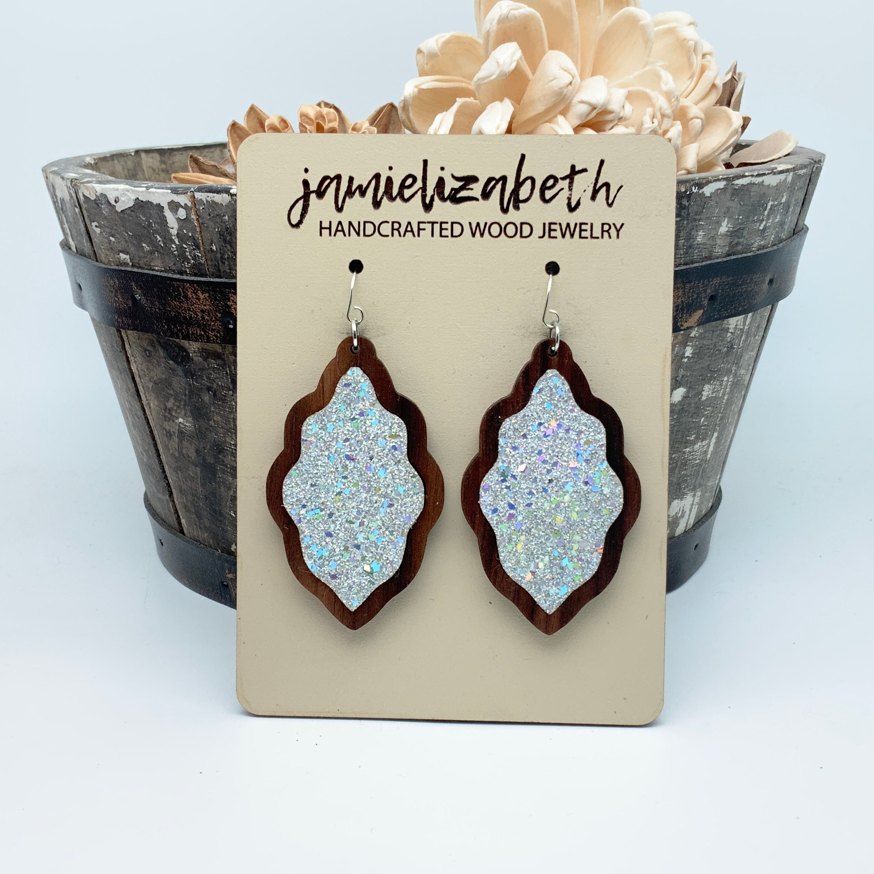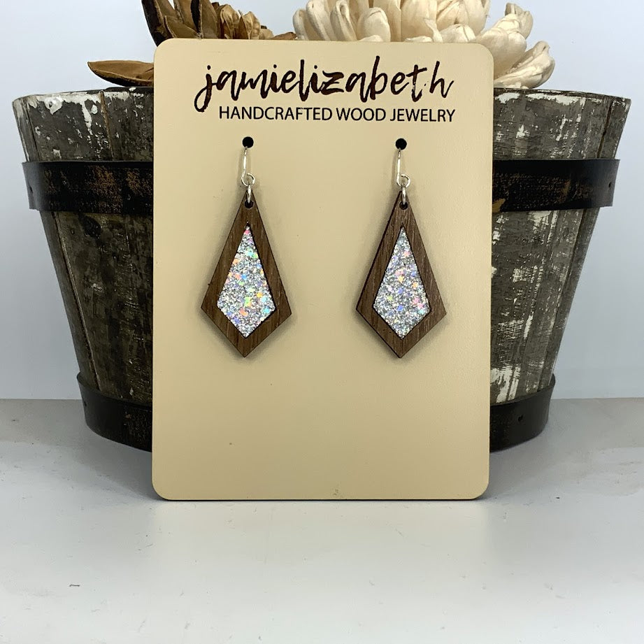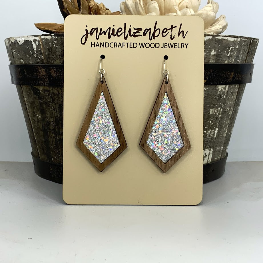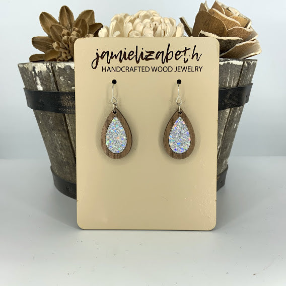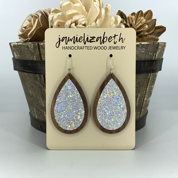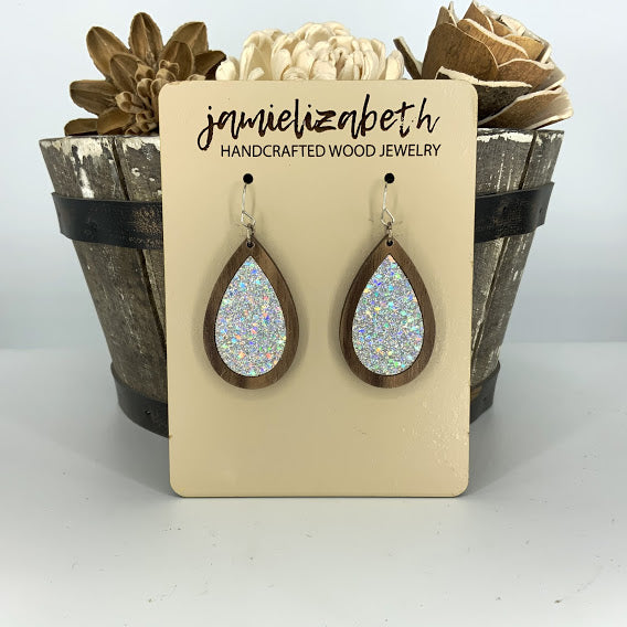 The best silver with the most sparkle EVER! Silver, with holographic colors when the light hits them - These earrings are seriously a show stopper! *Available in walnut only, as the maple just doesn't do these colors justice!