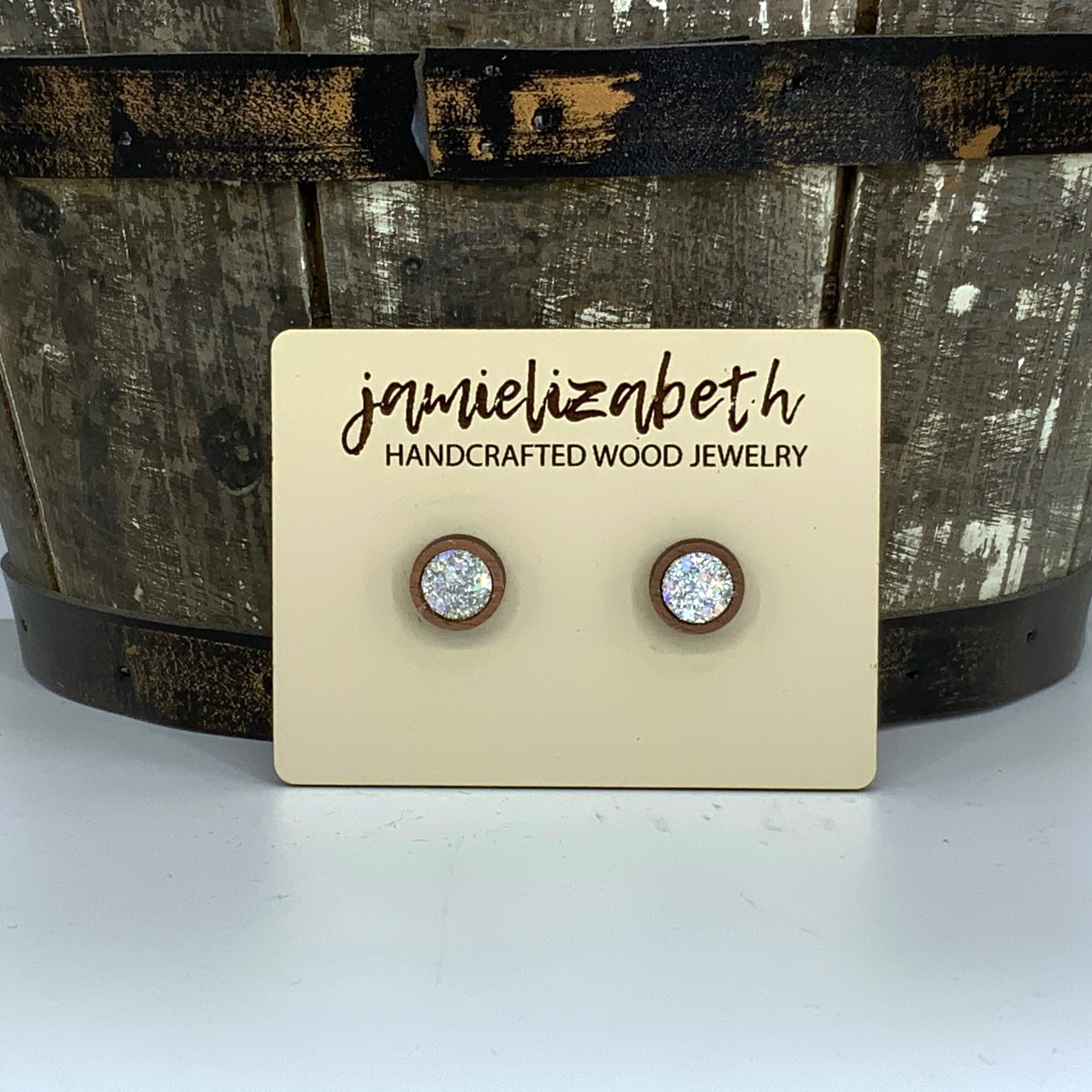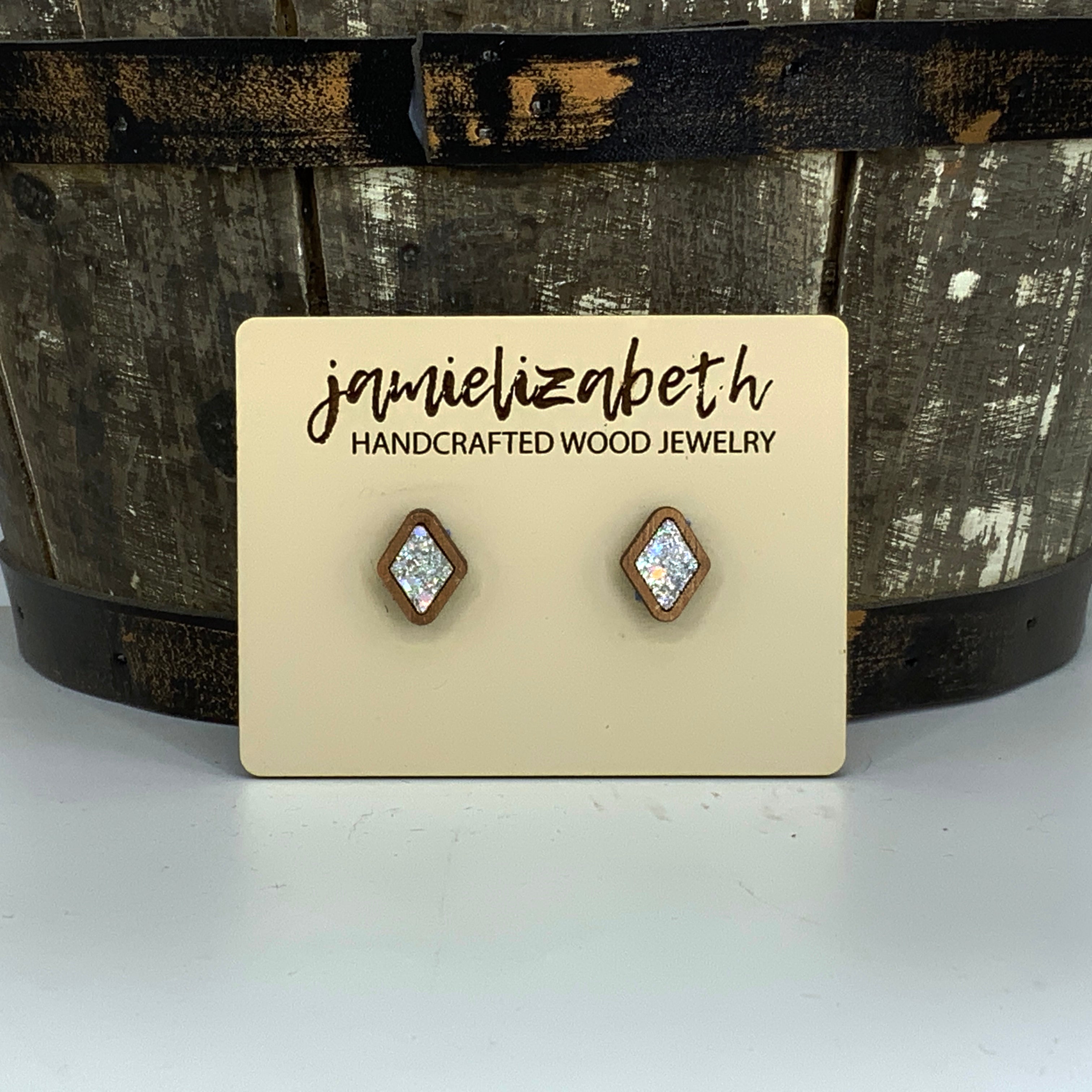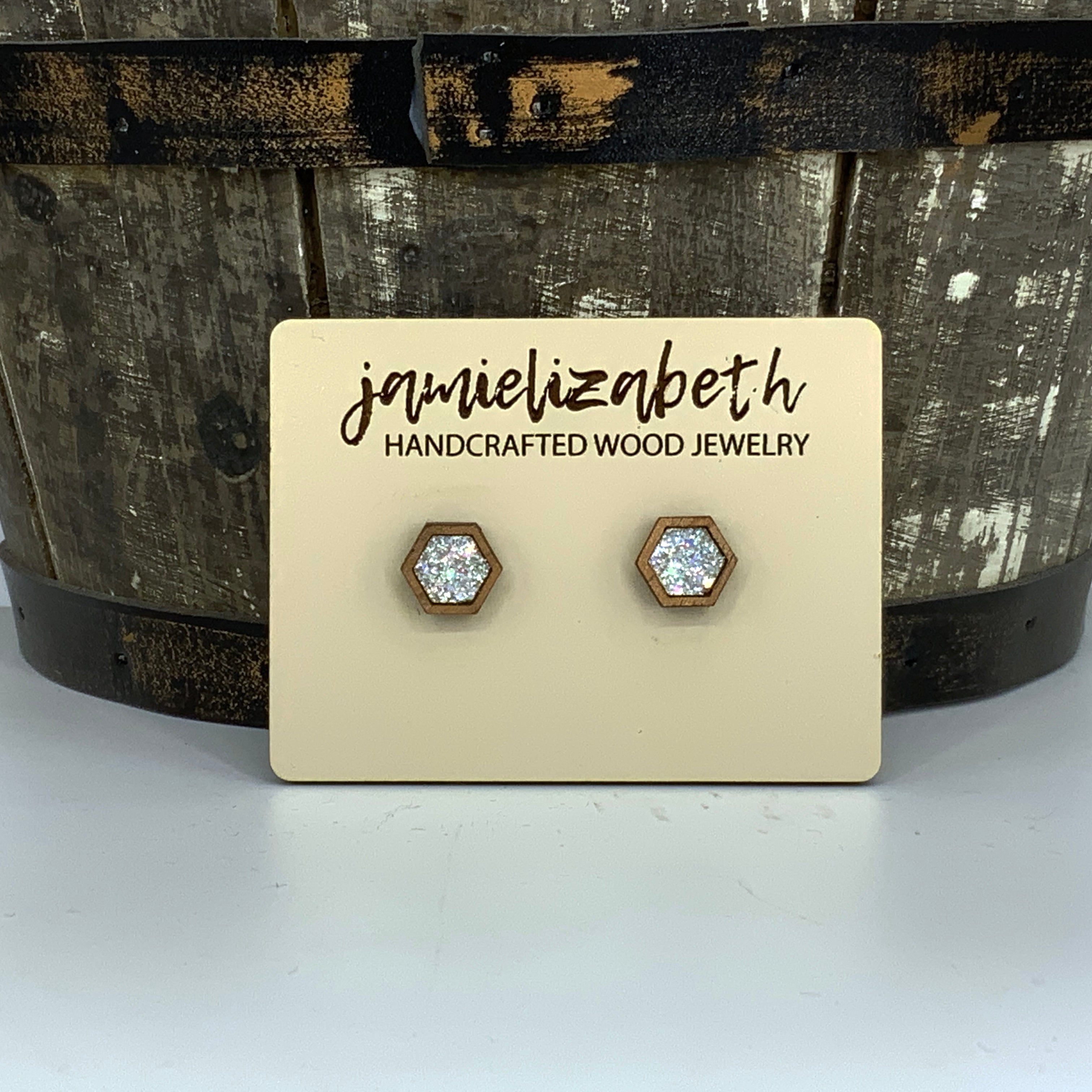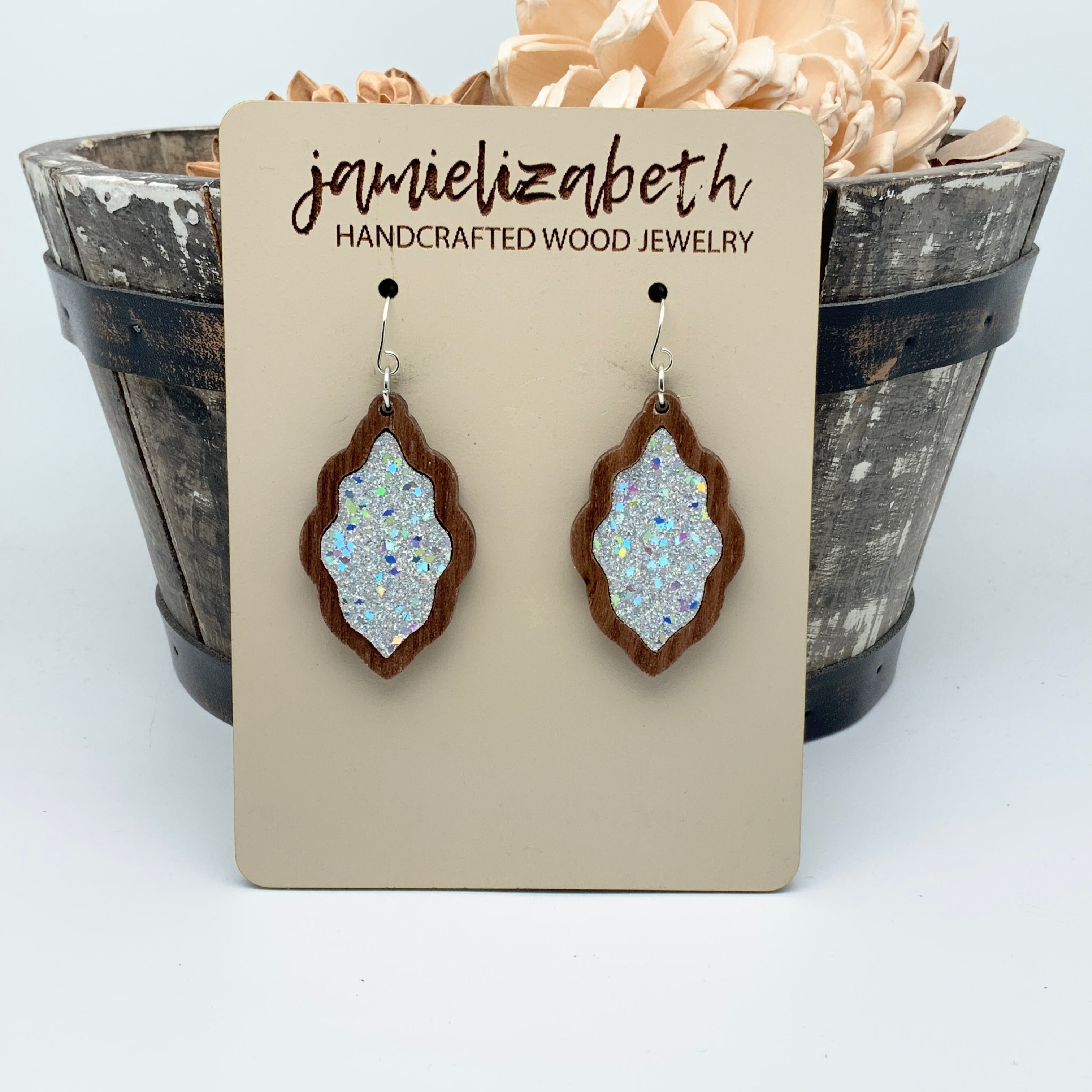 The best silver with the most sparkle EVER! Silver, with holographic colors when the light hits them - These earrings are seriously a show stopper! *Available in walnut only, as the maple just doesn't do these colors justice!
