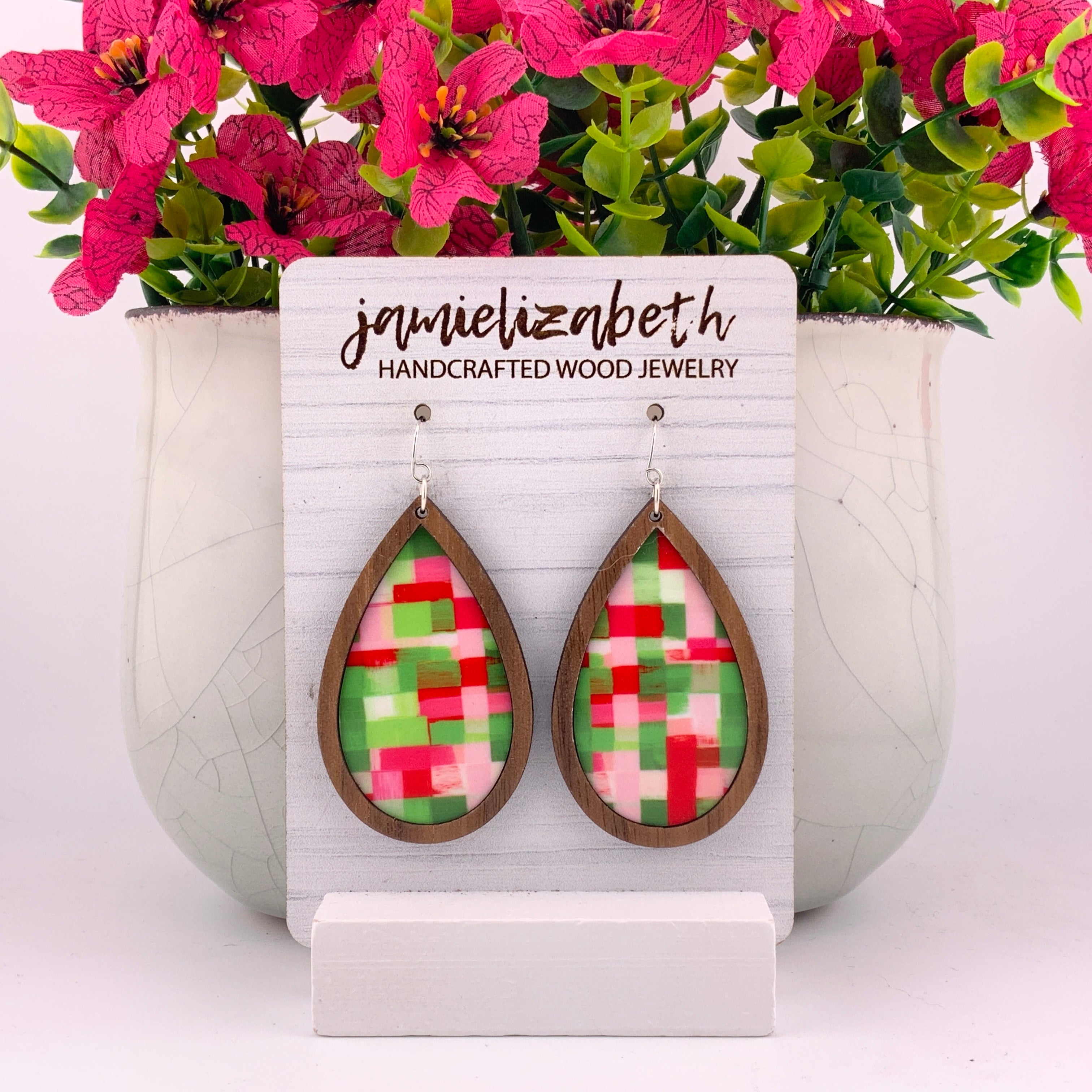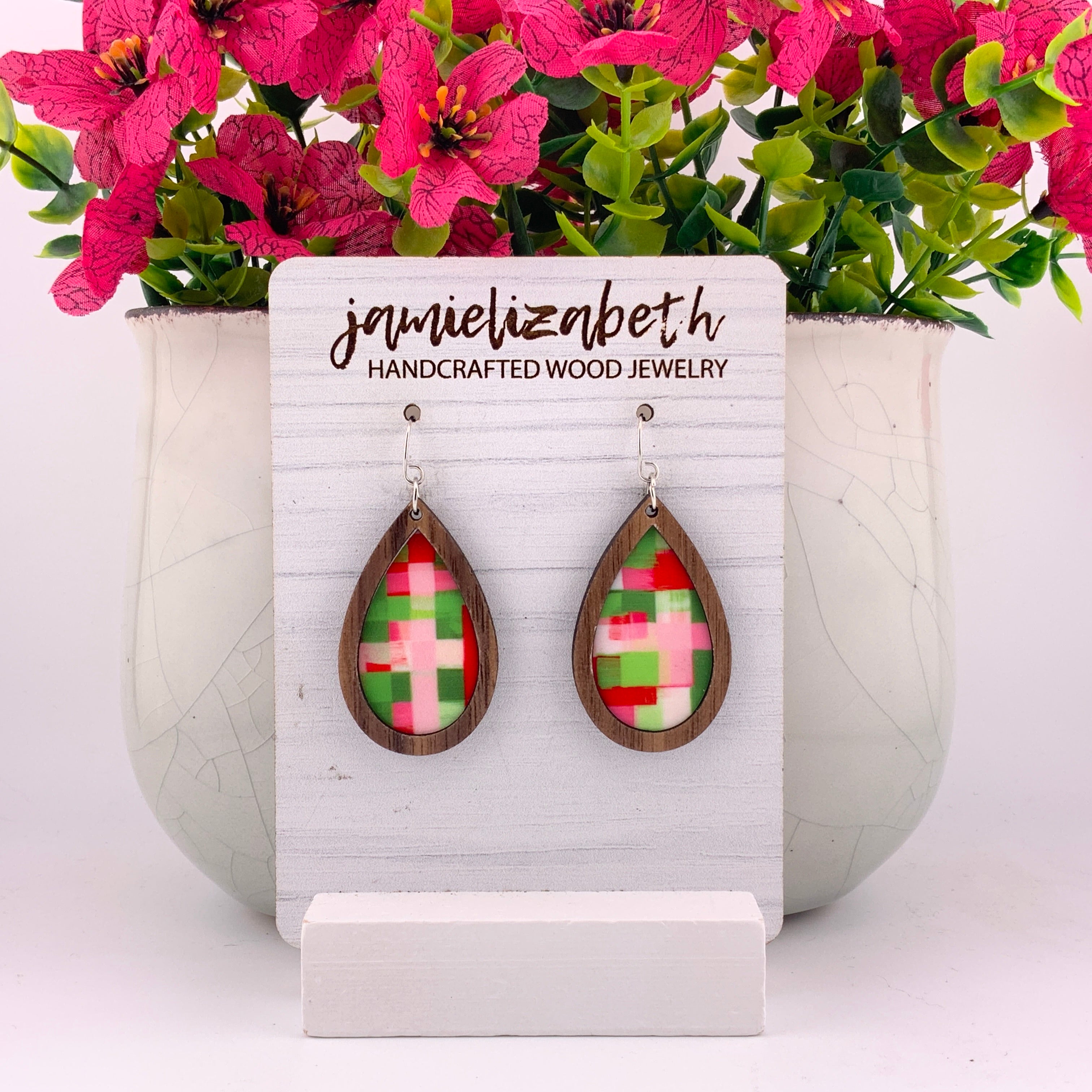 Bring classic holiday charm to your style with our Christmas Plaid earrings! Featuring a festive blend of red, green, pink, and white plaid framed in warm walnut wood, these earrings are the perfect mix of cheerful color and cozy Christmas tradition. Lightweight and easy to wear, they’re ideal for holiday outfits, parties, or gifting someone who loves fun seasonal patterns.