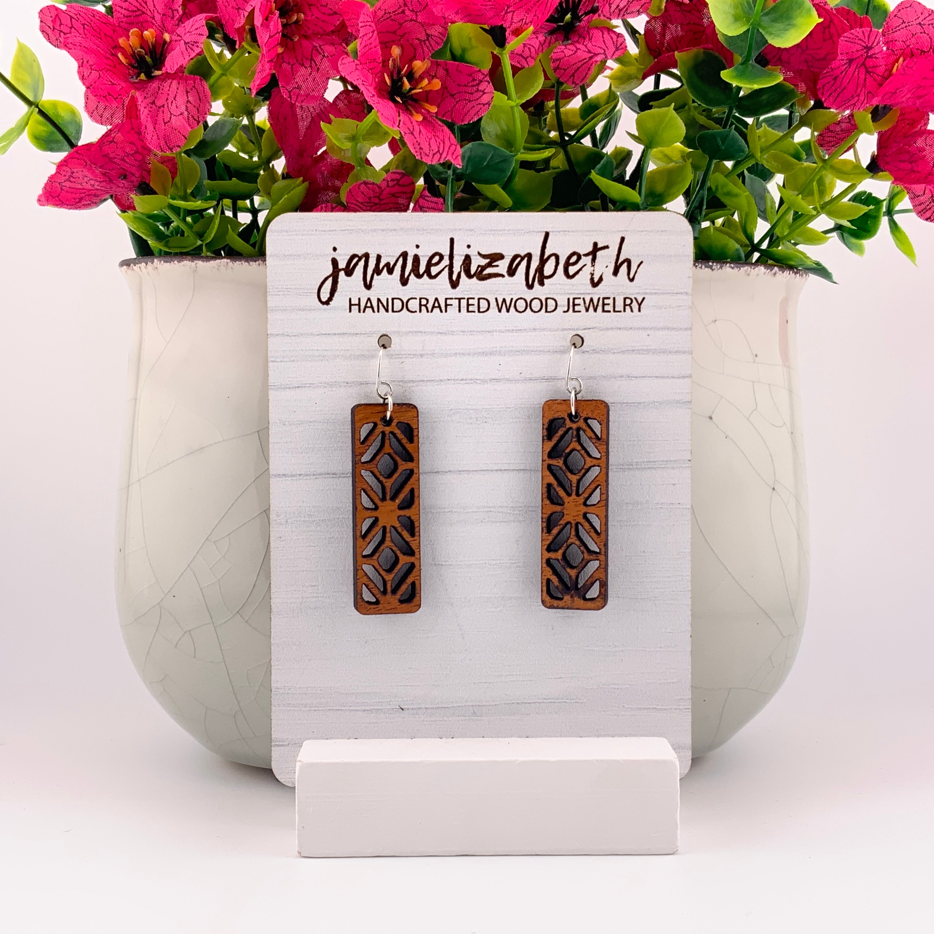 Rustic warmth meets modern design with our Mesquite Geo Bars. Each pair is crafted from richly grained salvaged mesquite wood and features a sleek geometric pattern that highlights both artistry and natural beauty. Lightweight and full of texture, they’re perfect for adding a touch of earthy sophistication to any outfit.