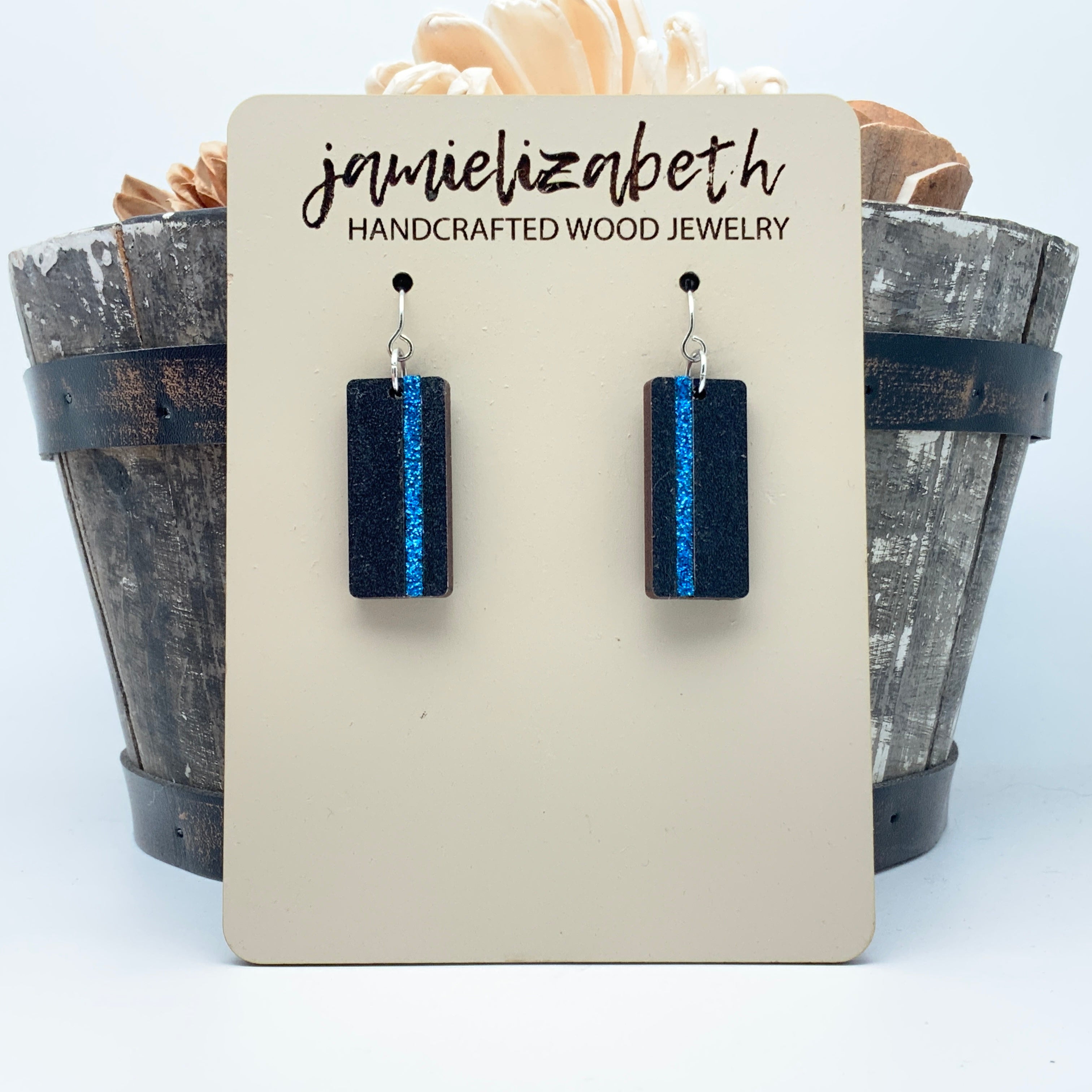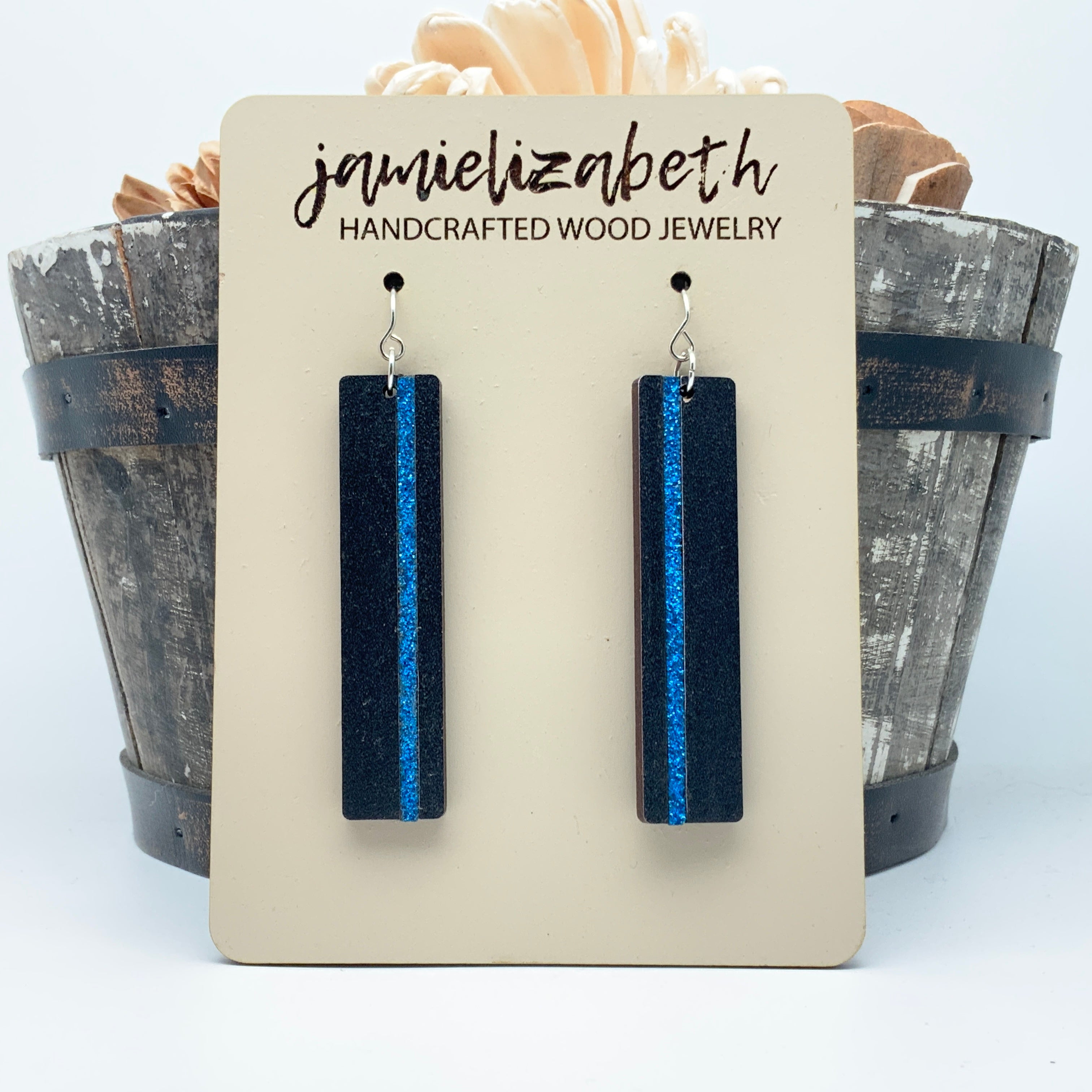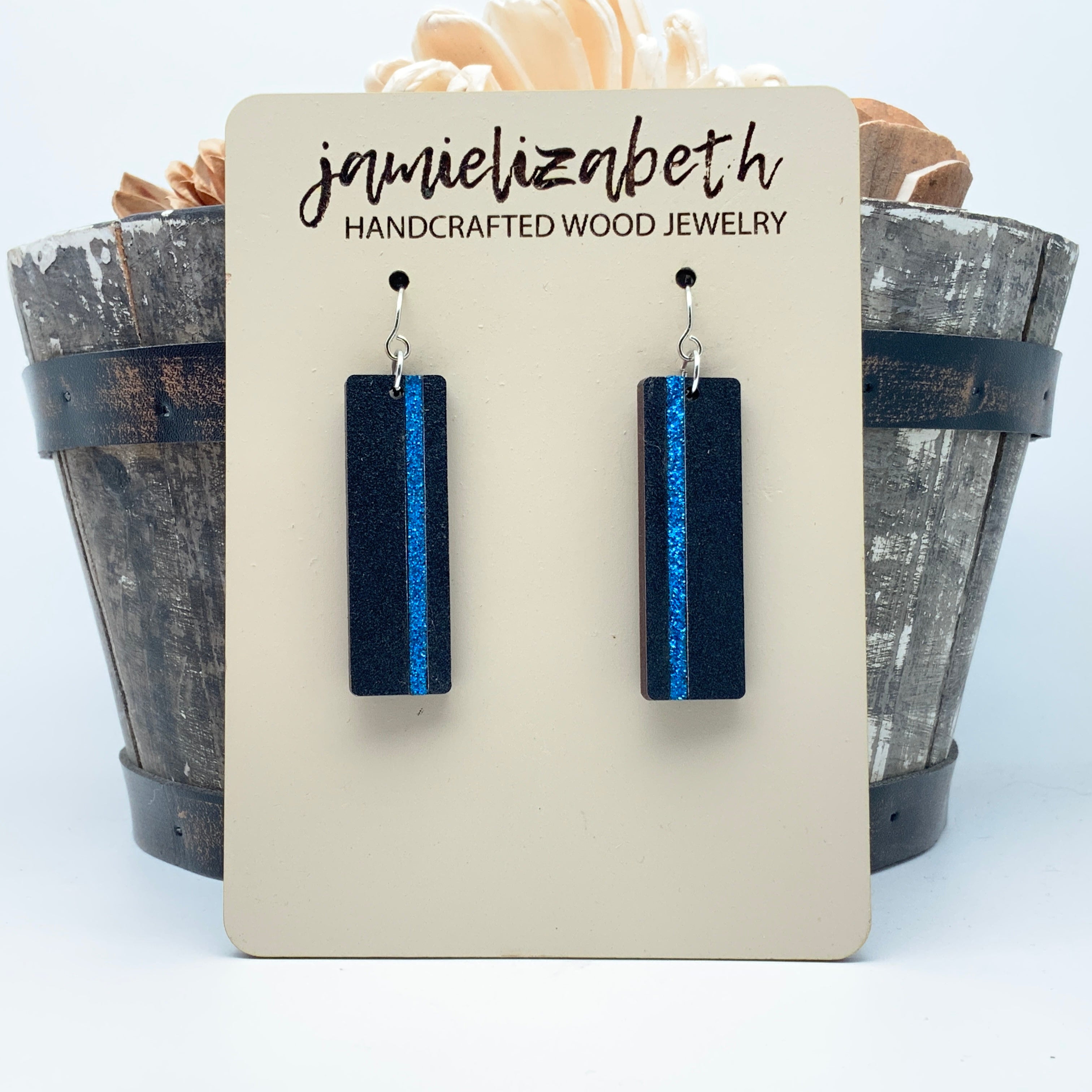 These one-of-a-kind earrings are a subtle way to show your support for the valiant members of our police force. Crafted with a timeless blue line glitter and a black background, they are a beautiful reminder of the service that protects and preserves our lives.
