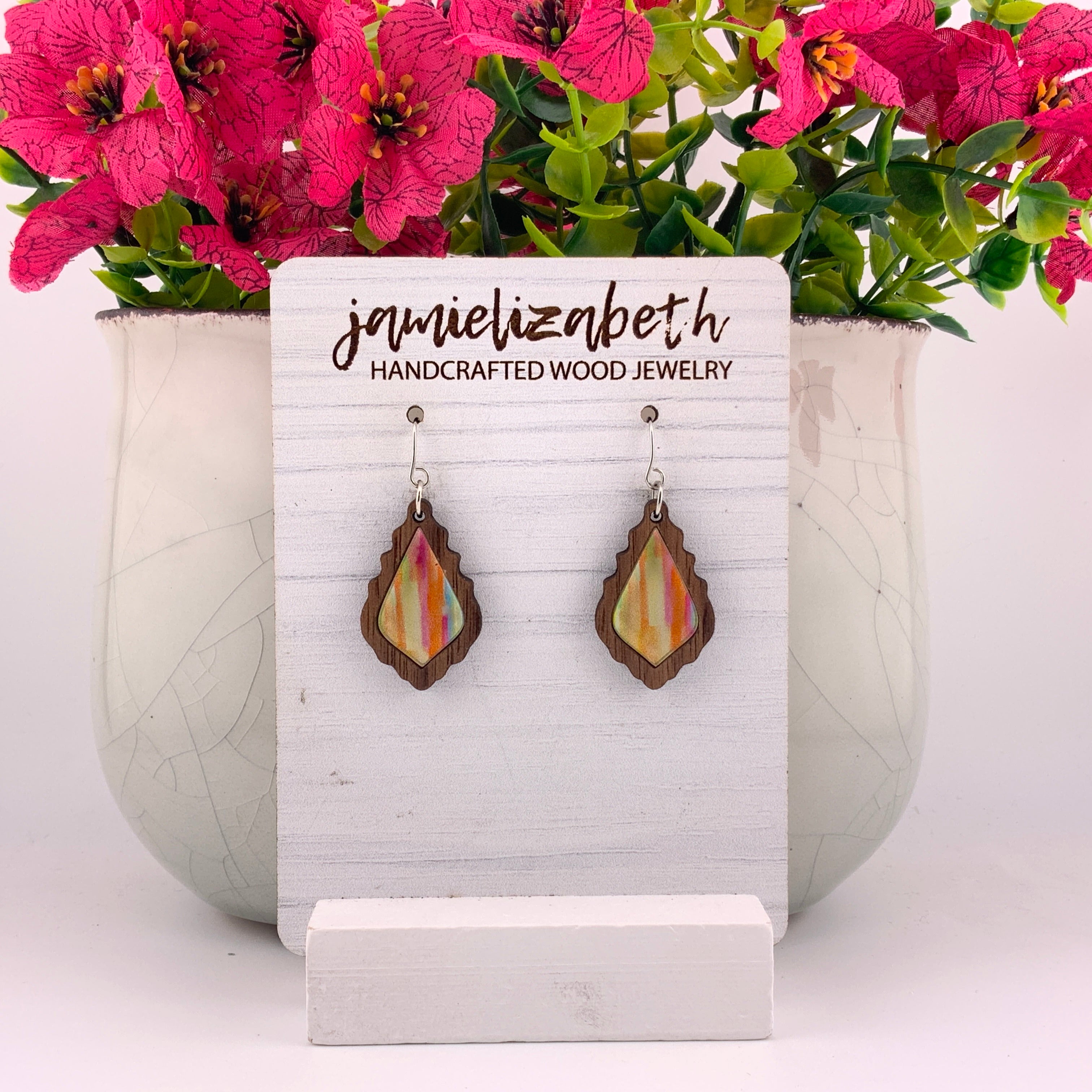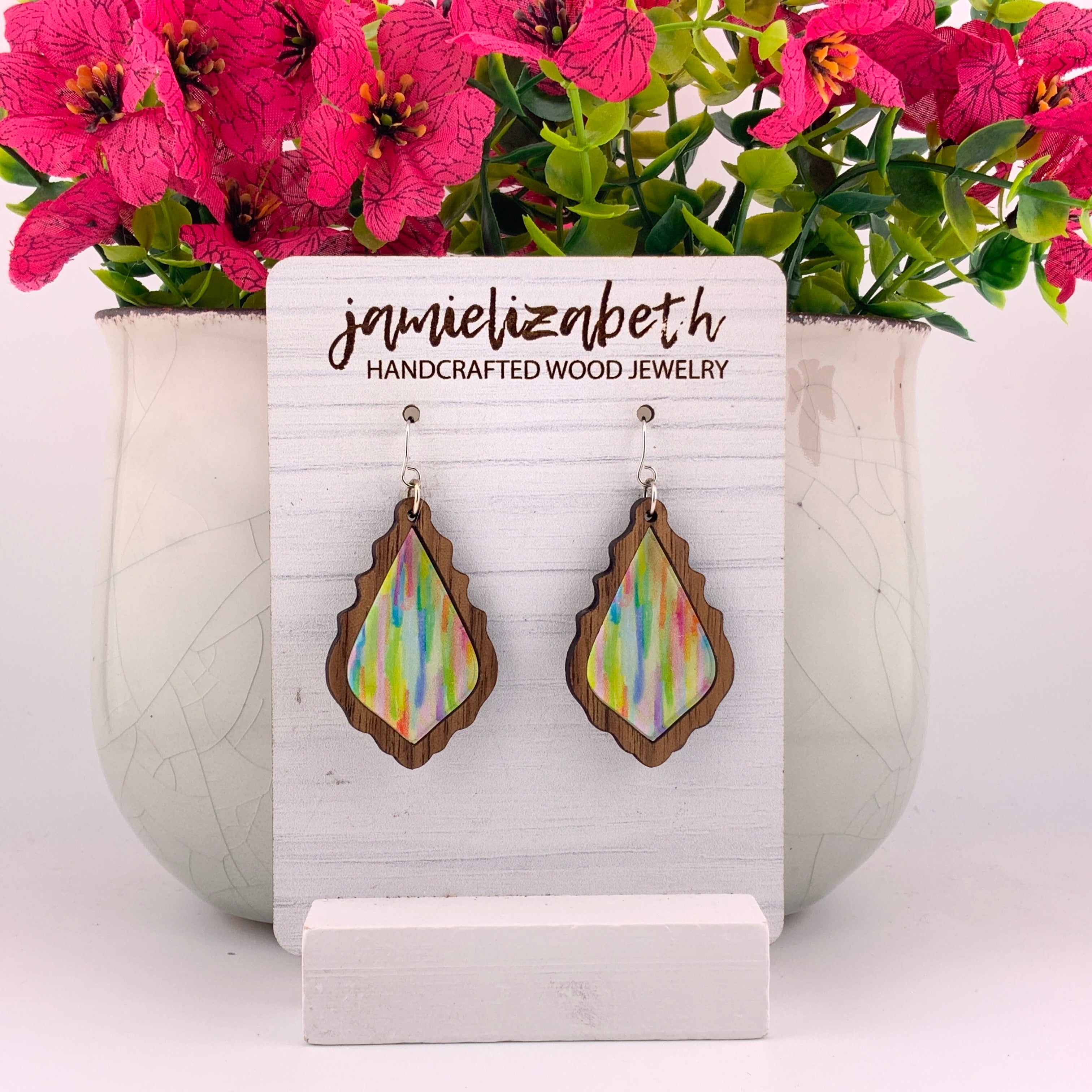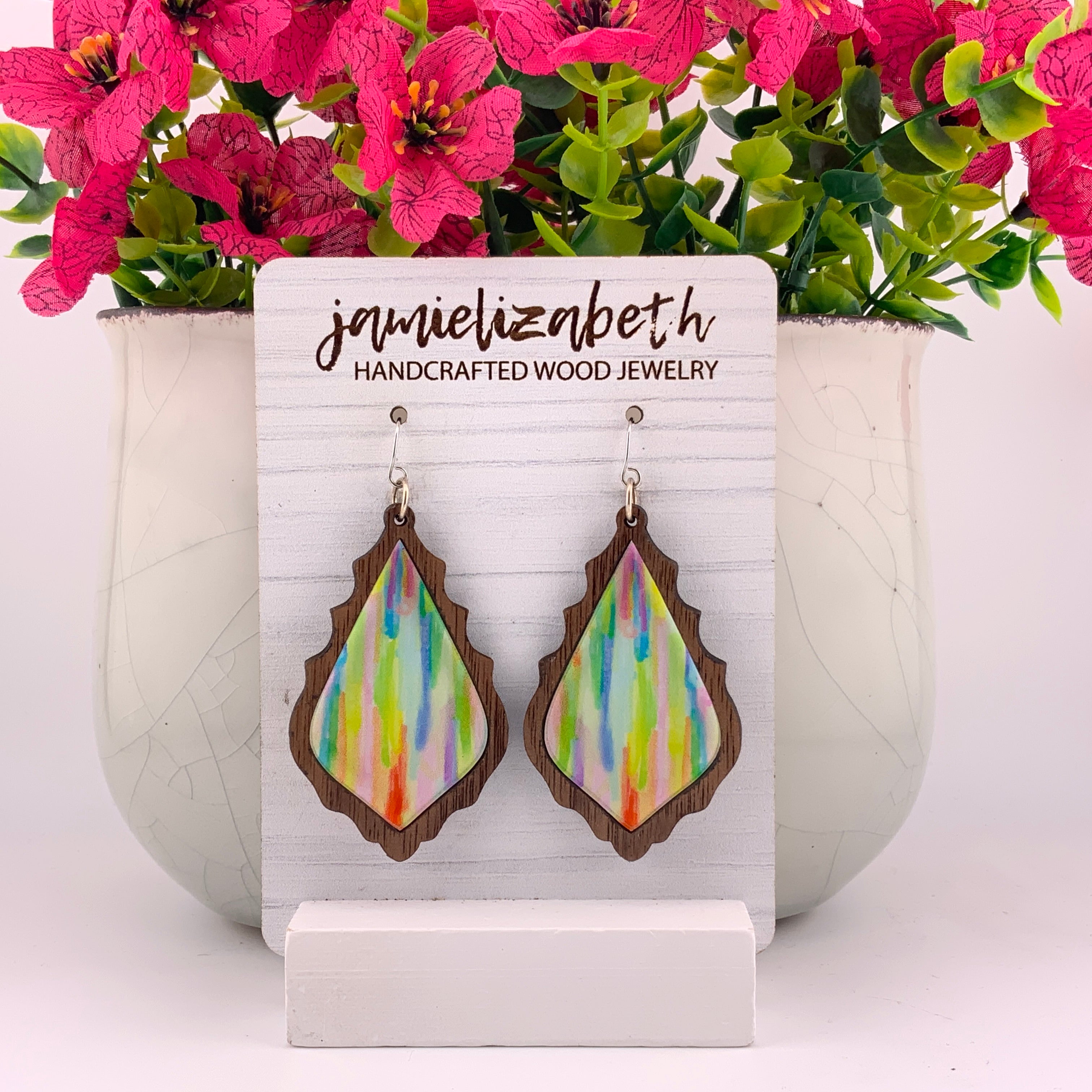 Add a pop of playful color to your style with our Striped Chandelier earrings! Featuring a vibrant, painted-stripe look layered into a bold chandelier shape, these earrings bring a fun and artsy touch to any outfit. Framed in warm walnut wood, each pair is lightweight, eye-catching, and full of handcrafted charm — perfect for both everyday wear and colorful statement moments.